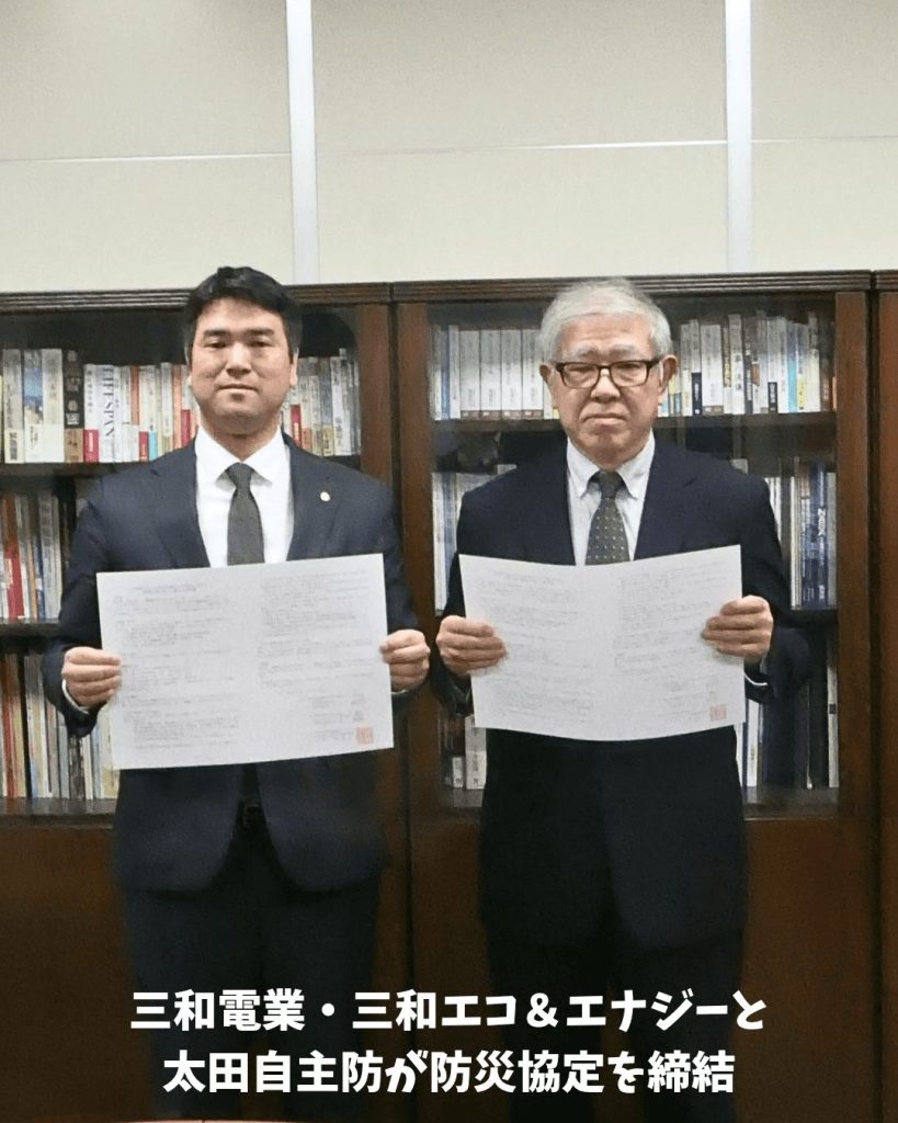 🟠1月26日、太田下町にある「三和電業」・「三和エコ&エナジー」本社で、山地代表取締役と太田自主防の髙嶋会長が出席し、両社と太田自主防による防災協定の締結式を行いました。