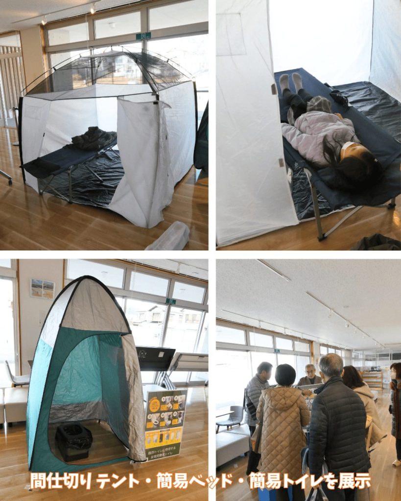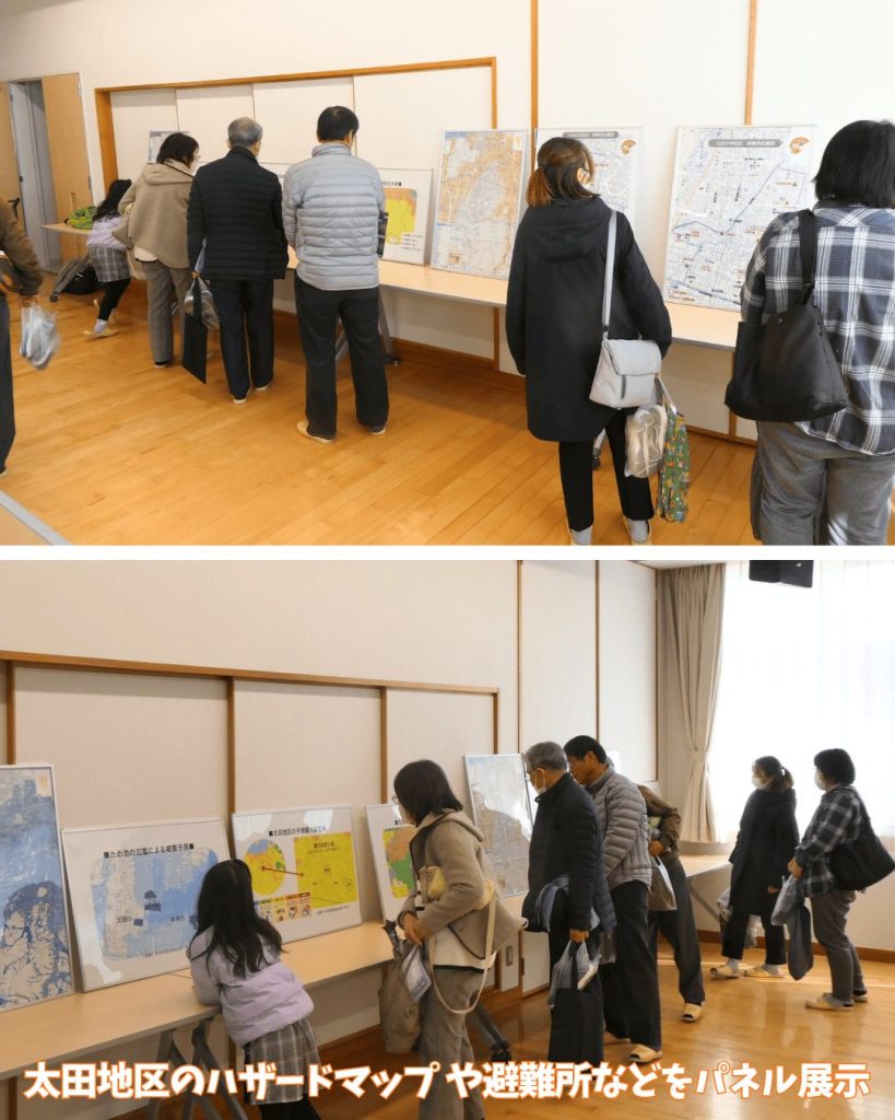 🟠会場内には太田地区のハザードマップや避難所地図のパネルに加え、簡易テント・簡易ベッド・簡易トイレなどの防災資機材も展示。 参加者の皆さんが興味深く見学されていました。