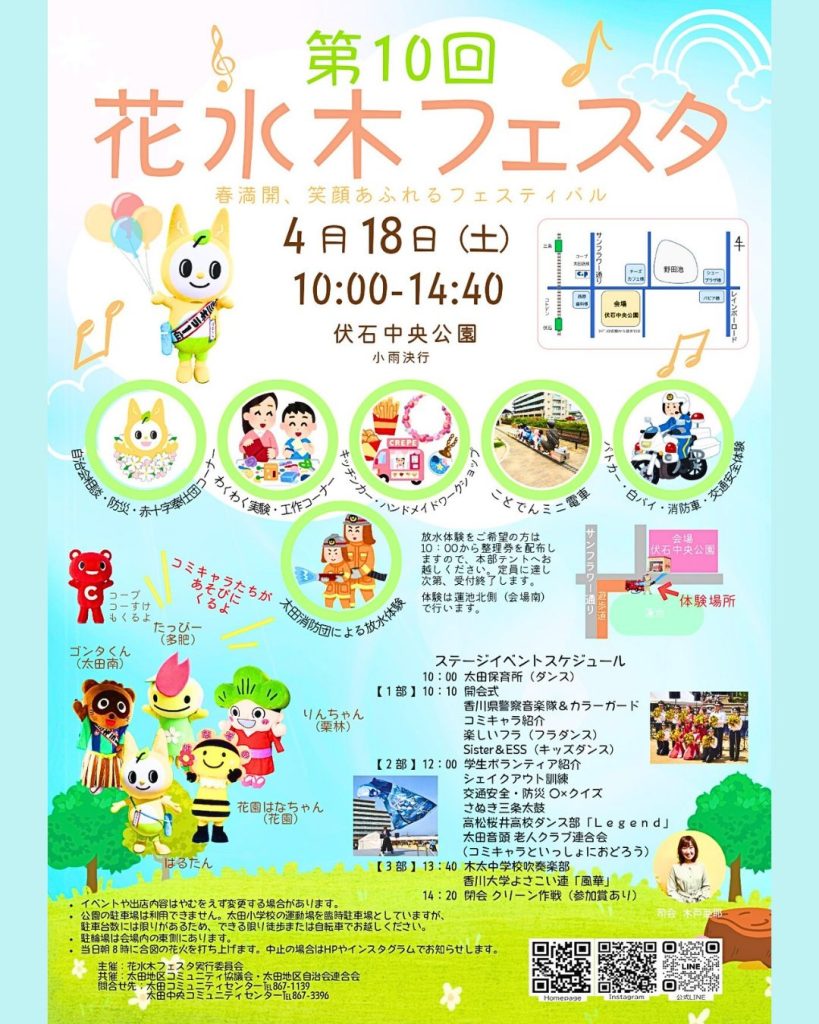 🌸ステージパフォーマンス、地域のグルメ、キッチンカー、働く車体験など、楽しいイベントがいっぱい、友だちのコミキャラも遊びに来るよ。ぜひお越しください!