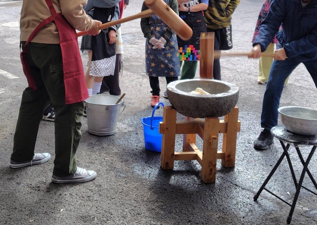 🟠子ども達は三か所に分かれて、2人ペアで交代しながら、杵と臼を使って、力強く餅をつきました。ついたお餅の形を整えて、美味しいあん餅、白餅ができました。